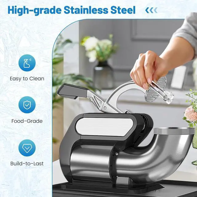 • [High-Efficient Ice Shaver Machine]: Guaranteeing efficient performance, this ice shaver machine with a 300W high power motor with a 1450 rpm rotating speed can grind up to 660 lbs/h. Plus, the lattice design and dual blades speed up the ice crushing, while the dual blades can also adjust the thickness of shaved ice.