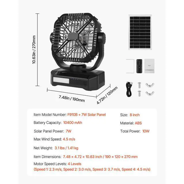 Powerful Wind: High-speed brushless motor delivers a cool, comfortable outdoor experience. Wind speeds range from 2.3 m/s to 4.5 m/s across 4 settings, easily handling various cooling demands. An ideal solar fan for keeping you cool in any condition