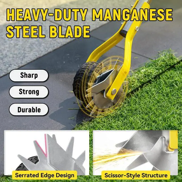 2.6" Wide Heavy-Duty Wheel: This sidewalk edger features a wide 2.6" rubber wheel that keeps it stable and balanced along lawn edges, even on uneven surfaces. The wide wheel design evenly distributes weight to reduce tipping, while deep grooves provide extra traction for better control. Reinforced brackets add strength and durability. This lawn edger makes it easier to maintain straight, clean edges and smoothly cut through thicker grass, giving you more precise and effortless lawn care.