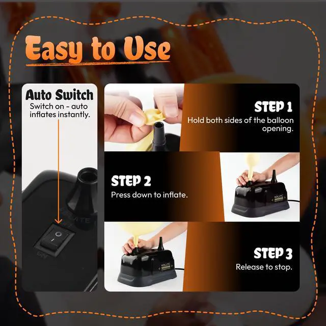 High Inflation Efficiency: Inflate dozens of balloons in minutes! This electric balloon pump delivers powerful airflow for quick and effortless inflation. Perfect for large parties or events where speed and efficiency matter.
