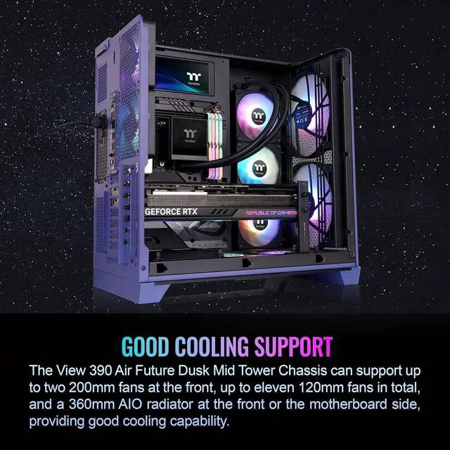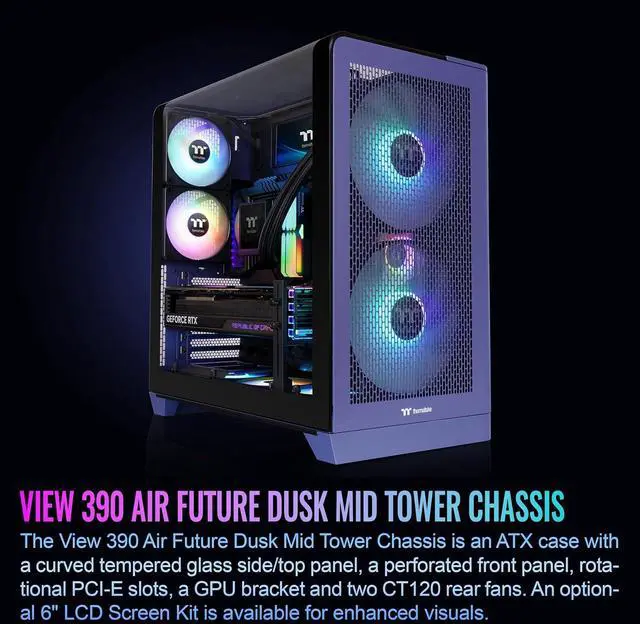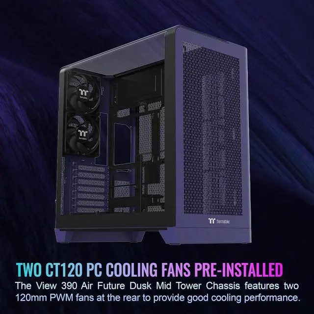 Thermaltake View 390 Air; Mid Tower; 2x120mm CT Fans Included; 360mm Radiator Support; 420mm GPU Clearance; Hidden Connector Support; Rotatable PCIe Slots; Future Dusk; CA-11F-00MNWN-00