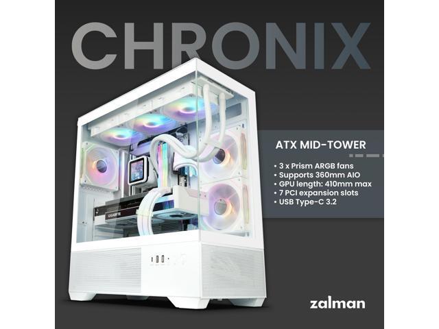 Zalman CHRONIX ATX Mid-Tower PC Case, 3 x PWM ARGB Fans with 6-Channel ARGB PWM Hub, USB Type-C, Supports 360mm Radiator, Up to 410mm GPU, White