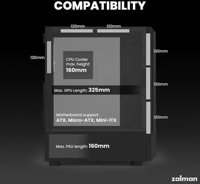 [Fit] Flexible Hardware Support: Accommodates standard ATX PSUs (160mm), GPUs up to 325mm in length, and CPU coolers up to 160mm in height for versatile build options