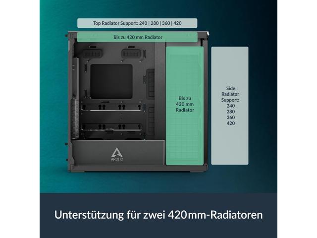 TWO 420 MM RADIATORS: Supports two 420 mm, 360 mm, 280 mm, or 240 mm radiators for high-performance AIOs and custom loops.