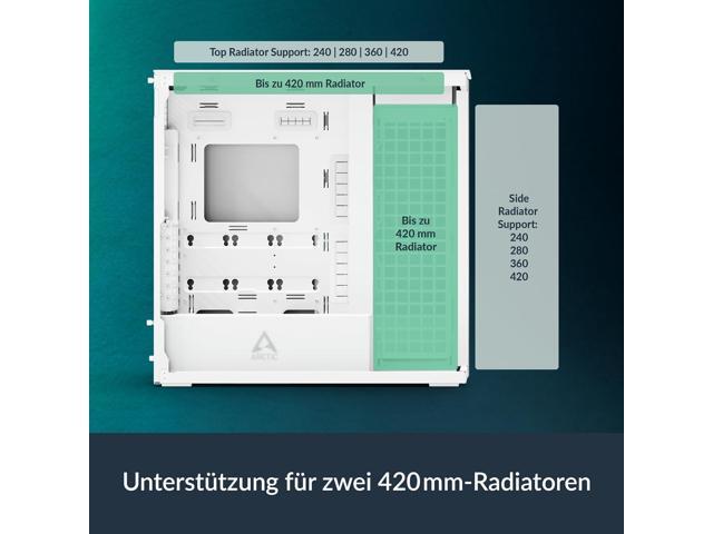 TWO 420 MM RADIATORS: Supports two 420 mm, 360 mm, 280 mm, or 240 mm radiators for high-performance AIOs and custom loops.