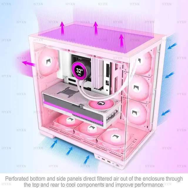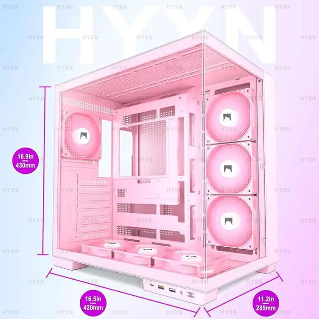 Dual-chamber aesthetic designHYXN H1 is a panoramic 270° wide-angle field of view ATX mid-tower rectangular structure chassis developed for aesthetics. The H1 is more spacious than most similar ATX cases on the market, providing users with a powerful and high-end configuration and a cool visual experience. The PC tower case is composed of two transparent tempered glass panels, which transmit light naturally, and the tempered glass has high hardness, not easy to be damaged, and has good sound insulation effect, providing great comfort for the office/gaming environment! (Length, width and height: 420*285*430mm/16.5"*11.2"*17.3)