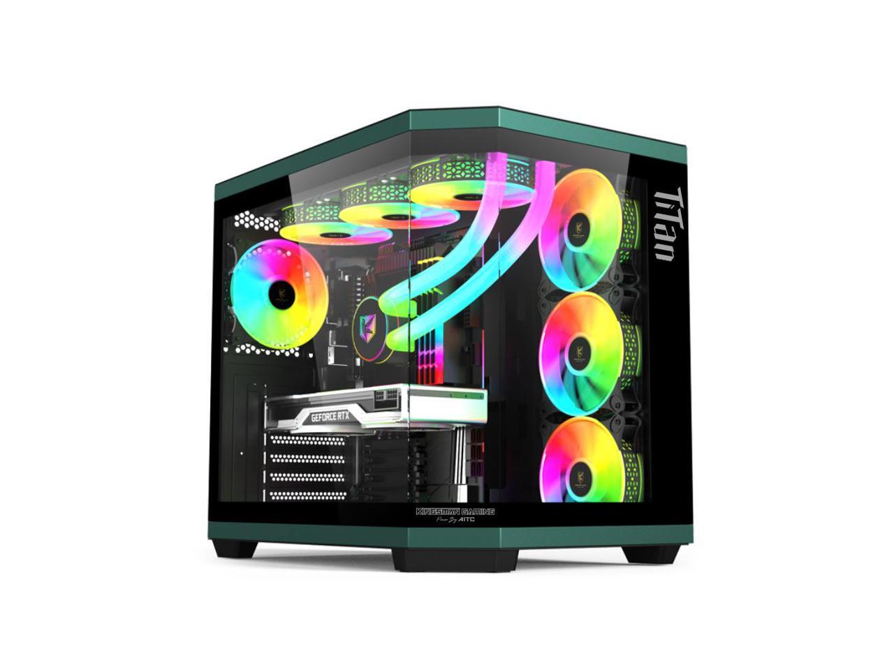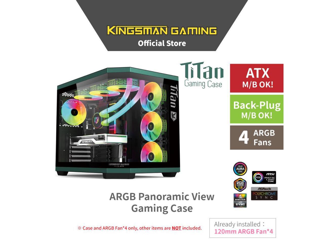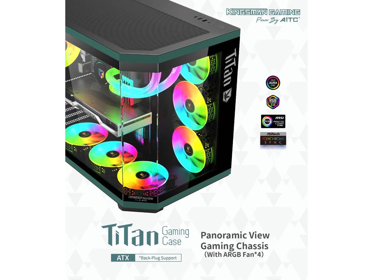 KINGSMAN TiTan Modern Aesthetics Dual-Cavity Panoramic Tempered Glass Mid-Tower ATX Computer Gaming Case, Pre-installed 4 ARGB Fans / Type-C USB3.0-BLACK