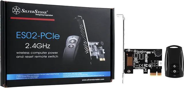 ES02-PCIE is a convenient remote switch kit designed by silverstone to wirelessly turn on/ off and reset a computer. By utilizing existing standard 2.4GHz RF wireless technology, PCI Express X1 slot, and power/ reset pin headers on a motherboard, the ES02-PCIE kit is easy to install and use within 20 meters of a connected computer. An included Y cable ensures your computer case's own power and reset buttons can be used concurrently with the ES02-PCIE if needed. Users looking for a simpler security solution than software access control will find ES02-PCIE to be a good alternative. Those with computers located in hard to reach area or has special usage scenarios will also find the ES02-PCIE to be very handy.