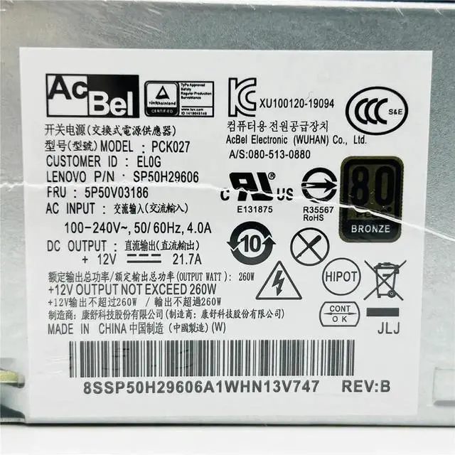 Upgrade your Lenovo small form-factor desktop with the Aomoproing 260W switching power supply. This unit is a direct, high-quality replacement for Lenovo OEM models: 5P50V03186, SP50H29606, PA-1261-7, and PCK027. It is fully compatible with Lenovo IdeaCentre 510S, ThinkCentre M420, 700-24AGR, V530S, M710e, M720e, and other 6Pin SFF systems.