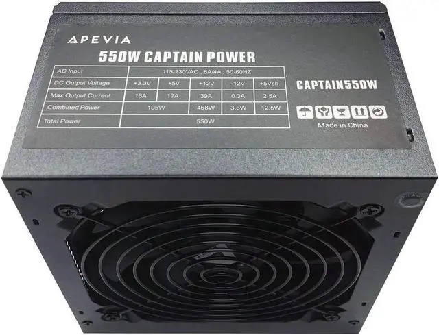 Apevia CAPTAIN550 Captain Series 550W Power Supply with 1 x 120mm Auto-Thermally Controlled Black Case Fan. 1 x 20 /24pin Main Power /1 x 12V (P8) / 1 x 6+2 PCI-express/ 3 x SATA/ 3 x Molex. 115/230V Switch, 5% Tolerance of 5V, 3.3V & 12V Output. Max. Output Current + 3.3V (16A), +5V (17A), +12V (39A), -12V( 0.3A ), +5Vsb( 2.5A ), Circuit/Over-Current/Over-Voltage/Over-Power/Under-Voltage/Over-Temperature Protections. For safety, do not overload, abuse or modify the power supply unit. Use of this unit for Bitcoin Mining is not suggested since it will shorten the life and cause failures of power supply.