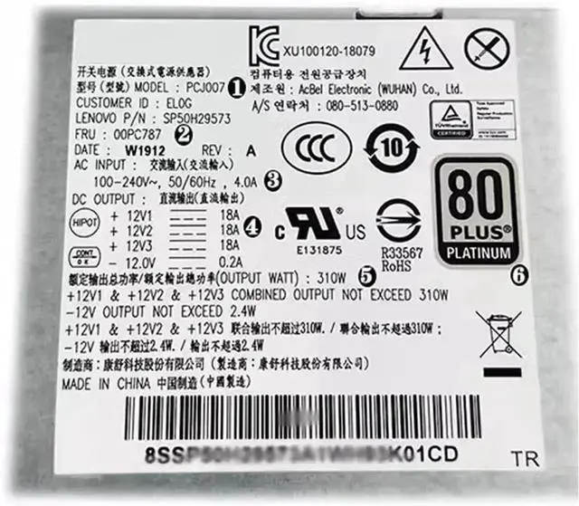 00PC787 PCJ007 SP50H29573 310W for M80T M70T M90S P340 P350 P360 SFF G5-14IMB05 Power Supply