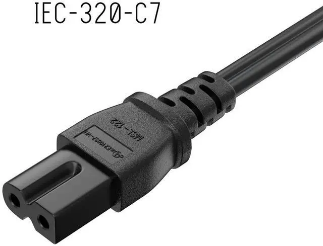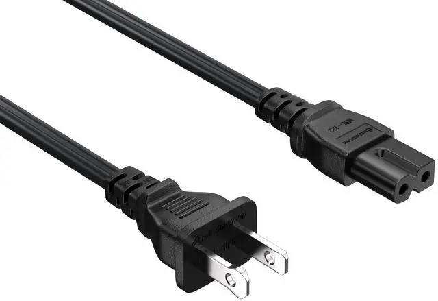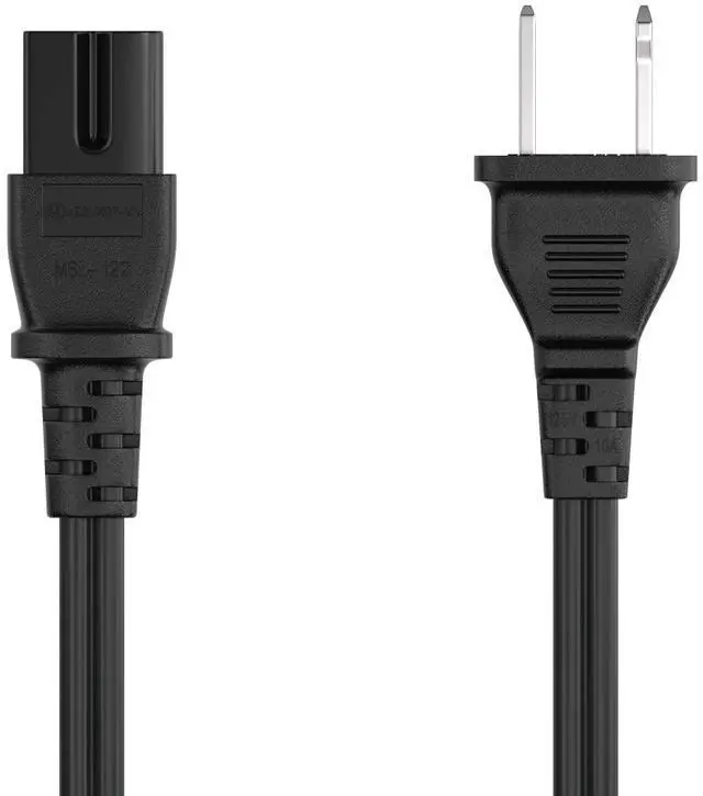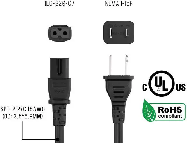 The 18 AWG Polarized Laptop Power Cord is a high-quality, versatile solution for powering various electronic devices. This heavy-duty cord features a NEMA 1-15P connector on one end and an IEC C7 polarized connector on the other, making it compatible with laptops, VCRs, DVD players, and other devices that require a 2-slot polarized connection. Constructed with 18 AWG SPT-2 conductors, this power cord ensures optimal power delivery and durability. The fully molded design enhances its longevity and resistance to wear and tear, making it an ideal replacement for damaged, overused, or missing power cords. With a 10A/125V rating, it provides ample power for most consumer electronics. Safety is paramount in the design of this power cord. It boasts UL and cUL listings, as well as CSA approval, ensuring compliance with stringent safety standards. The polarized configuration of the NEMA 1-15P and IEC C7 connectors guarantees proper connection and reduces the risk of electrical issues. This power cord is not only functional but also environmentally responsible. It complies with both RoHS and REACH directives, making it an eco-friendly choice for conscientious consumers. The black color maintains a professional appearance and blends seamlessly with most electronic setups.