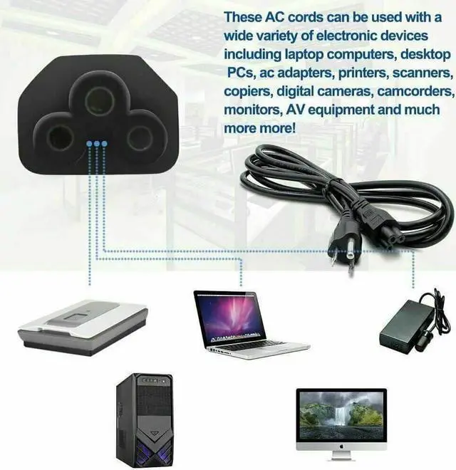 Compatibility: Fit all 3 prong laptop AC adapters · Acer Aspire E1 E11 E3 E14 E5 E15 ES1 R11 R3 R7 S3 V15 V3 V5 V7 S5 S7 R7 M3 M5 Timeline Ultra; 5250 5253 5315 5349 5515 5517 5532 5750 Acer Chromebook 15 14 13 11 CB3 CB5 C720 C720p C740 C910 · ASUS K53E K55A K55N N56VZ U47A U56E X55C E402MA F200CA F202E K200MA K553MA N550JK N550JV Q200E Q302UA Q400A Q500A Q501LA Q502LA Q550LF Q551LN R503U S200E S400CA X102BA X200CA X201E X202E X200MA X401A X501A X502CA X550CA X551CA X551MAV X553SA X555LA Vivo Book ASUS ZenBook UX31A UX32VD UX301LA UX303LB UX303LN UX303UA UX303UB UX305CA ASUS ROG Gaming G46VW G55VW G73JH G74SX G750JM G750JW G750JX G751JL G75VW GL551JW GL552VW Q551LN · Toshiba Satellite C55 C75 C655 C855 L505 L655 L755 L855 P755 S855 C55D C55DT C55T C75D CL15T E45T L55D S55; Radius 11 14 15 L15W E45W P55W L75 · HP Pavilion; Envy TouchSmart Sleek book 13 14 15 17 M6 M7 Dm1 Dm4 Dm4t Dv3 Dv4 Dv4t Dv5 Dv6 Dv6z Dv7 2000 G42 G56 G60 G61 G62 G71 G72 HP EliteBook; ProBook 2540p 2560p 2760p 4430s 4520s 4530s 4540s 4730s 6460b 6560b 6930p 8440p 8460p 8470p 8530p 8560p 8560w 8570w HP Spectre x2 x360; Stream 11 13 14; Chromebook 14; 11 G1 G2 G3 G4 · Lenovo ThinkPad Helix Edge 11 13 14 15 E530 E545 T400 T410 T420 T430 T440 T530 T61 X1 Carbon X131e X201 X220 X230 Lenovo IdeaPad 500s S210 S510p U430 U430p U530 Y700 Z510 Z710 Yoga 11 11s 13 14 15 2 Pro Flex 2 3 10 14 15 Lenovo Essential G500s G505s G510S G700 G710