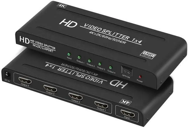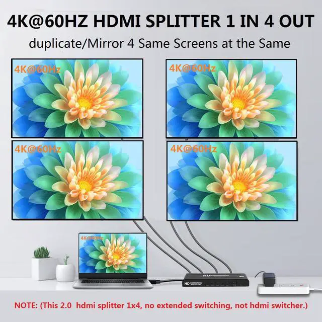 1. 4 Port hdmi 2.0 splitter -4K Hdmi splittre 1 in 4 out can Copy 1 HDMI input signal to 4 identical HDMI output signals, supports full HD 4Kx2K@60Hz,1080p@120Hz/60Hz,3840x2160@60Hz,1440p@60Hz and 3D resolutions.(Note: The 1x4 hdmi splitter with power Only mirroring/copying Only mirror/copy, no extended switching, not hdmi switcher, Does Not Support 4 Input 1 Out)