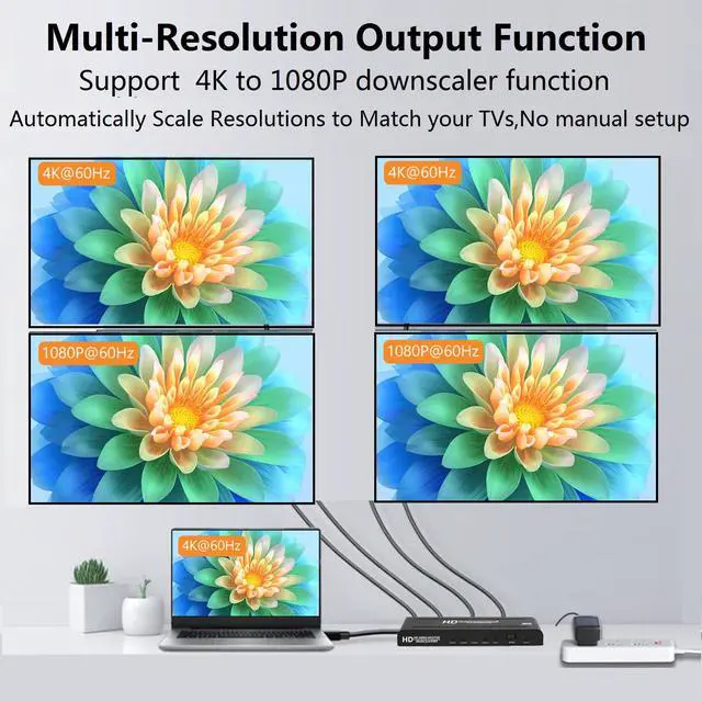 2.4 port hdmi 2.0 splitter support Auto downscaler function and Multi-Resolution Output Function :The 4K 1x4 hdmi splitter 1 in 4 out Support 4K to 1080P downscaler function and mixed 4K & 1080p display outputs, Automatically Scale Resolutions to Match your monitor,The 4K video source device can simultaneously display 4K content to 4K monitors and 1080p content to 1080p monitors via downscaling; Note: (not support mixed 2K & 1080p output;not support resolution downscaling from 4K @60Hz “YUV 4:2:2” to 1080p )