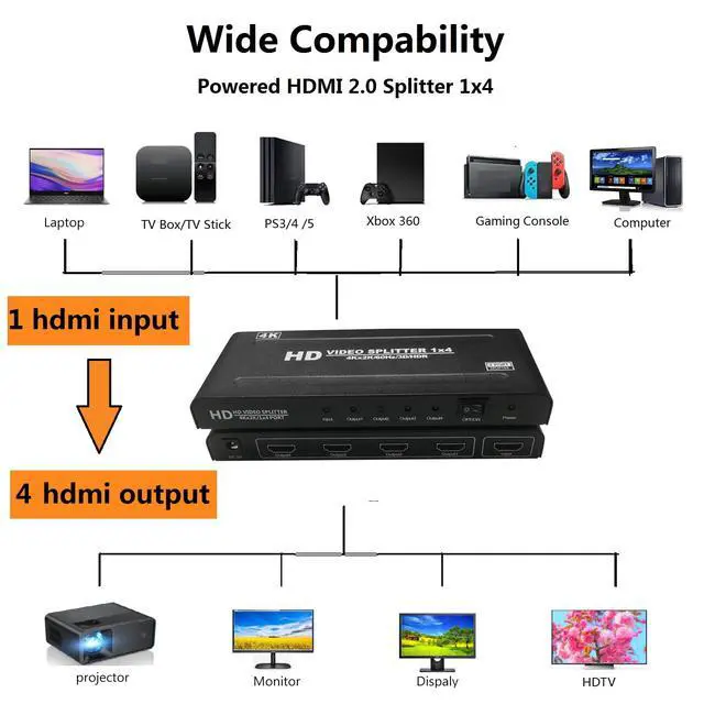 1. This 4kx2k hdmi splitter 1x4 One Input Port: Compatible for computer, XBox 360, XBox one, PS3, PS4, ps5,Fire Stick, Blu-Ray DVD player, Satellite Receiver, Route Roku, Chromecast, PC, Laptop,Gaming etc.