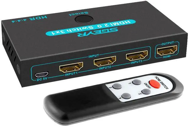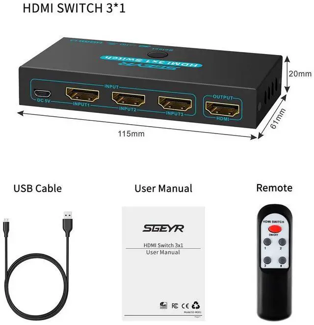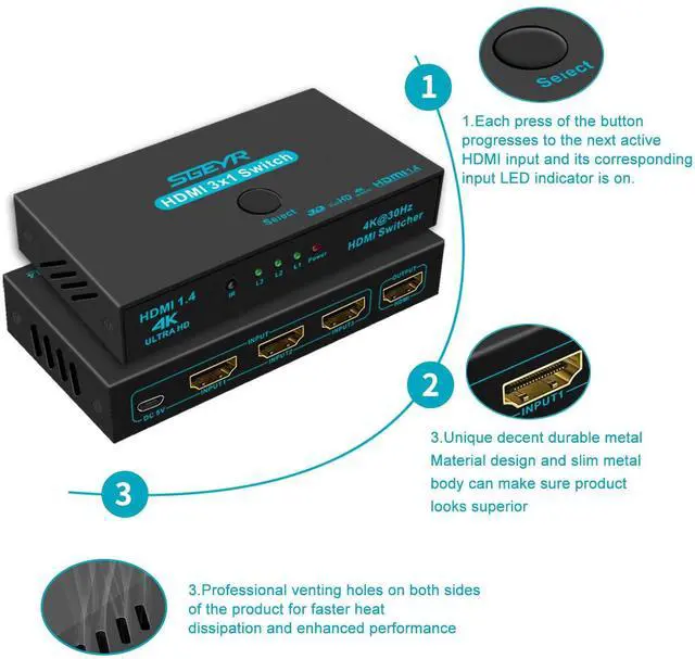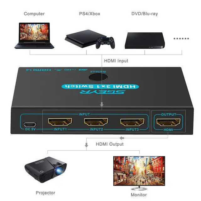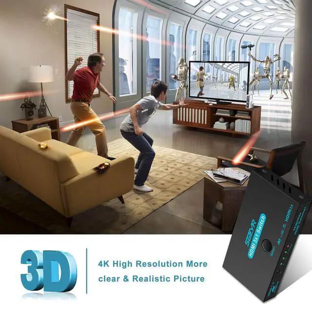 SGEYR HDMI 1.4 (HDCP 1.4)Switch Box allows you to switch between Three HDMI sources to One HDMI display (3-in, 1-out) Plug-N-play,manually press the button or IR wireless control this 3x1 hdmi selector switcher easily.Supports Full HD, 3D,signals up to 4K@30Hz