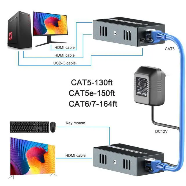 The HDMI extender boasts an impressive transmission range of up to 50 meters (164 feet) utilizing Cat5e/6/7/8 network cables, offering unparalleled flexibility in configuring your audiovisual systems. Whether you're linking your computer to a remote display or disseminating content across multiple screens in a professional environment, this device guarantees a robust and dependable signal. Its versatility and reliability make it a must-have for any audiovisual setup, ensuring seamless connectivity and optimal performance.