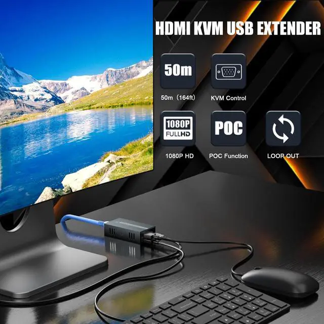 HDMI KVM USB Ethernet Extender Over Cat5e/Cat6/Cat7/Cat8-164ft Long-Range Transmission, 1080p@60Hz Clarity, 3D HD Loop-Out, POC, Mouse & Keyboard Support - Ideal for Offices & Classrooms