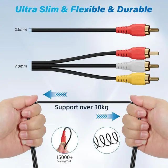 Our Advantages: Durable and flexible design thinner and more flexible made of high-quality PVC material offering excellent oil resistance abrasion resistance and acid-alkali resistance. Passed 15 000+ bend tests to ensure long-term stability of use----Clear and stable audio and video signals no static no buzzing no noise----High-quality pure copper wire core and corrosion-resistant connectors 24K gold-plated plugs providing high-speed data transmission----Tight and secure connection to ensure continuous and stable signal transmission----Color-coded plugs red white and yellow plugs with clear colors for easy and quick installation and correct signal matchingHigh
