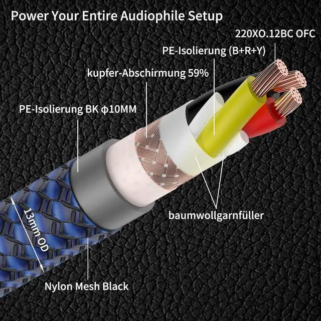 EXCELLENT DESIGN4N OFC+copper multi conductors made+Cable Total Diameter 13mm perfect replacement for old unreliable power cables. RELIABLE CABLERate at 125V/15A 3-Prong US Version IEC 320 C15 Connector Plugs no soldering needed standard size specifically to deliver high-current power needed by audio amplifiers thick and tough no more fear of wire breaking down after a few years of use with extra shielding. And easy to unplugged and plugged back in definitely will not get damaged unless you intentionally try to. BUILT TO LASTShell Material is Polyester Braided Sleeves adding to the durability and tangle free. WIDELY USAGECompatible with most power filter turntable amplifier CD player DAC and any hifi components.
