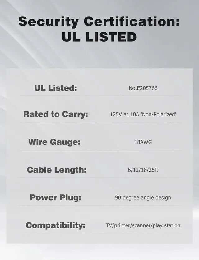 Ancable 90 degree angled power cable has strong compatibility and adaptability it is a high-quality replacement cable compatible with most LG/TCL/ LED TV Canon Pixma/ Epson/ printer models. 18 AWG power connector for Sony PS5/ PS4/PS3 Slim Xbox One SX and more. SAFETY / UL LISTED this cable is tested and proved to be reliable resilient maximum safety durability and long life.