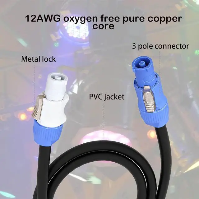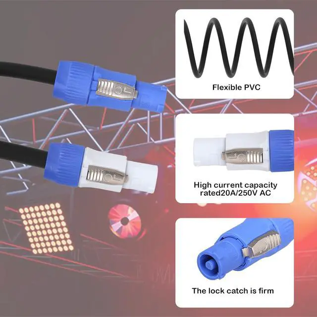 Wide Device Compatibility: Powercon connector cables is Fits for used as power sources for various audio service industrial equipment such as LED displays stage lighting speakers mobile beam lights sound measurement testing and control automation and machine tool industry equipment etcquality materials: The main body of the power input to power output cable is made of professional PVC material for high-quality stage lighting equipment which can be freely bent and has excellent flexibility. The inner core is made of oxygen free pure copper effectively reducing resistance and heat generation. The joints are made of engineering plastic and nickel plated contacts ensuring stable transmission sensitive contact high wear resistance and ensuring stable current transmission in various environmentsReliability: The Stage Light powercon cable has waterproof and dustproof performance and a locking design which can adapt to various harsh environments. After connection the transmission is stable wear-resistant and durable making it easy to expand multiple links to meet complex lighting wiring requirements (please note that the input and output interfaces are not interchangeable)