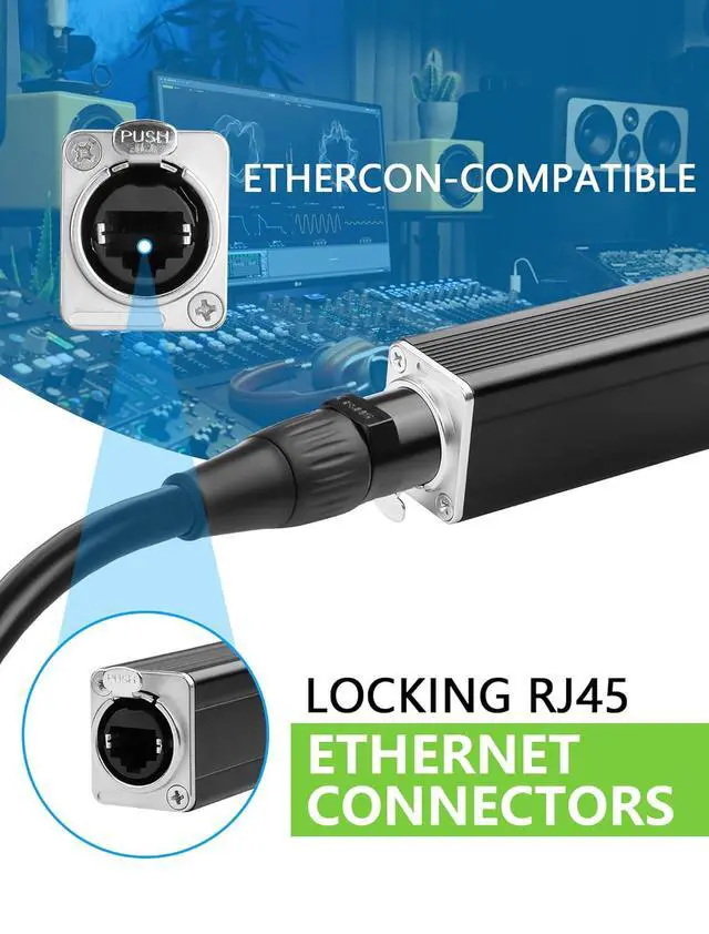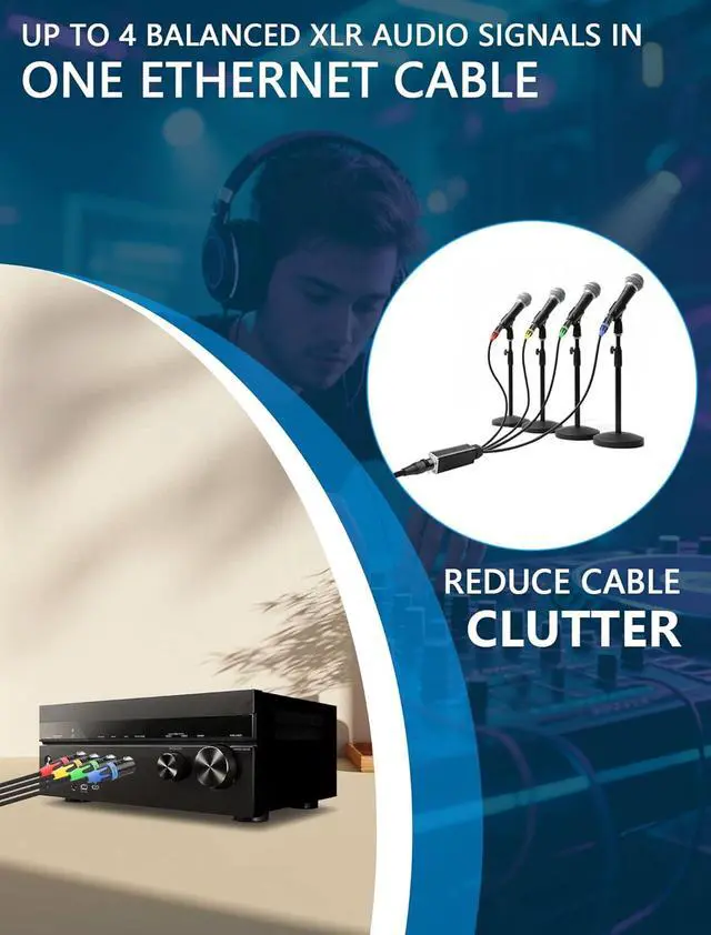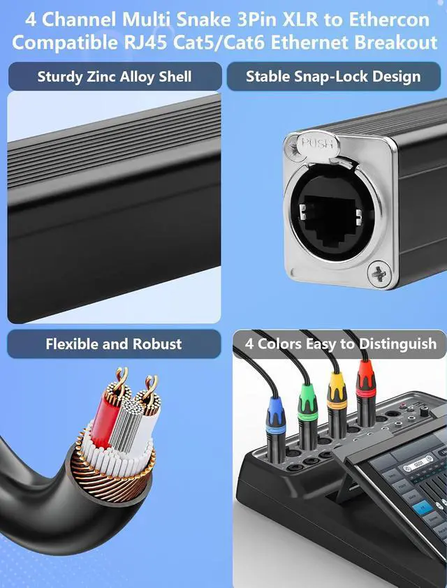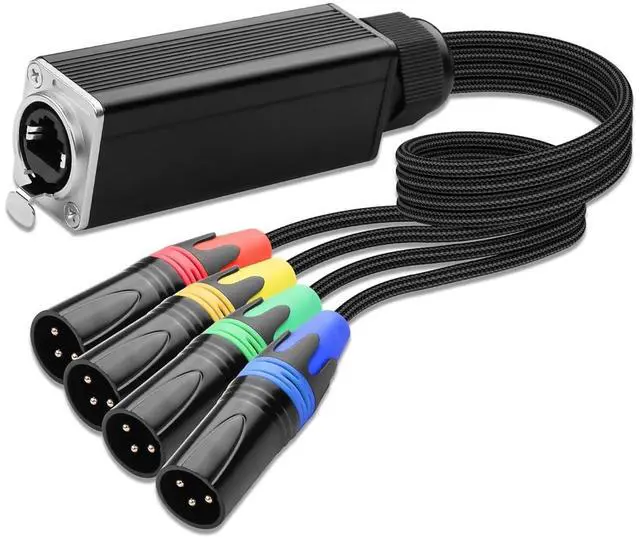 4-Channel XLR to Ethernet Adapters - This adapter allows you to transmit up to 4 channels of XLR audio or 3-pin DMX control signals across stages studios DJ venues and live events over a single connection. Eliminating the need for multiple cables and reducing setup complexity4 Separate DMX Lighting Control Integration - Beyond audio supports DMX signals for lighting control. Connect your LED stage lights fog machines lasers and other DMX-controlled effects through 3-pin XLR connectors allowing you to manage up to 4 separate lighting channels from a central location. This minimizes long cable runs from the control room and simplifies your lighting setupEtherCON-Compatible RJ45 Connectors - The locking RJ45 connectors ensure a secure connection during live performances or in high-vibration environments.