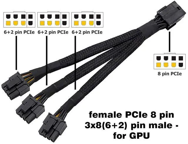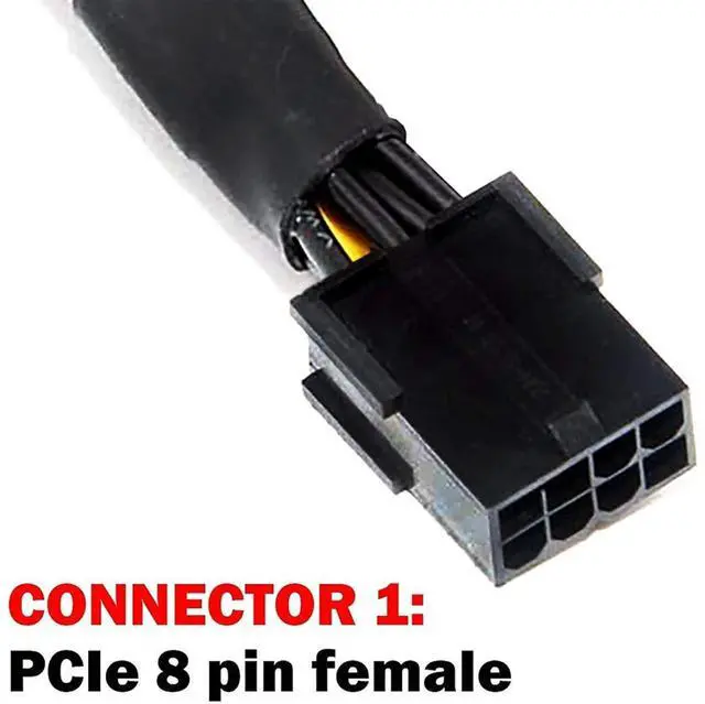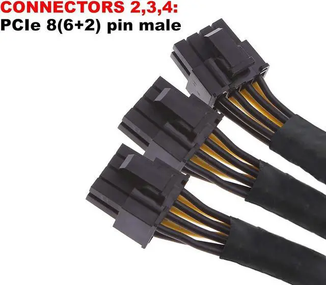 Connector 1(Photo #3): PCIe 8 Pin Female - connect to power supply PCI-e 8 pin; Connector 2 3 4 (Photo #4): PCIe 8(6+2) Pin Male - connect to graphics cardConvenient solution for adding threee extra PCI Express connectors to your existing power supplyThe 8 pin PCIe Female end to plug into the PCIe 8 pin Male output cable of the non modular or semi modular power supply and three 8(6 +2) pin male ends to plug into the video graphics card. NOTE - This splitter cannot be used to power motherboards!!! (This is NOT EPS 8 Pin cable!!! )Compatible with 6-pin & 8-pin graphics cards from popular manufacturers from ASRock Radeon AMD Sapphire EVGA and GigabyteThe length of the product (Approx): 12-inches.