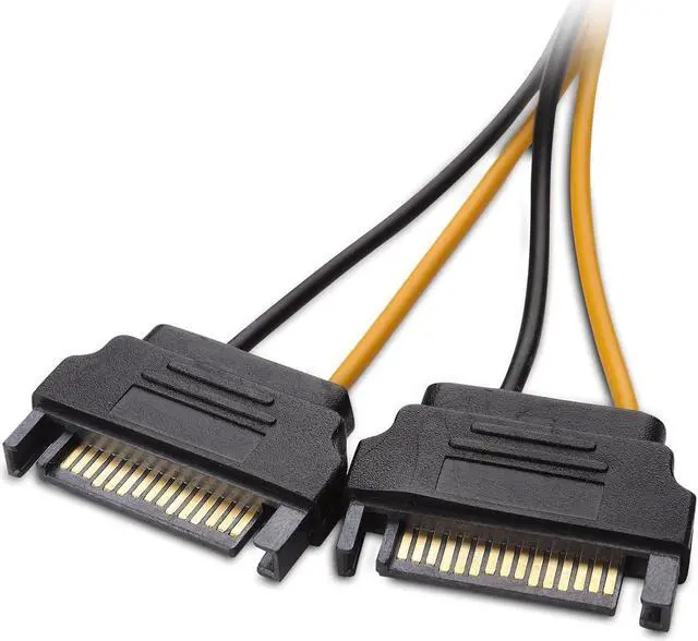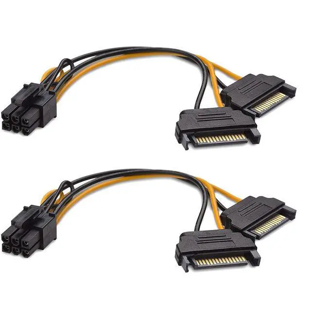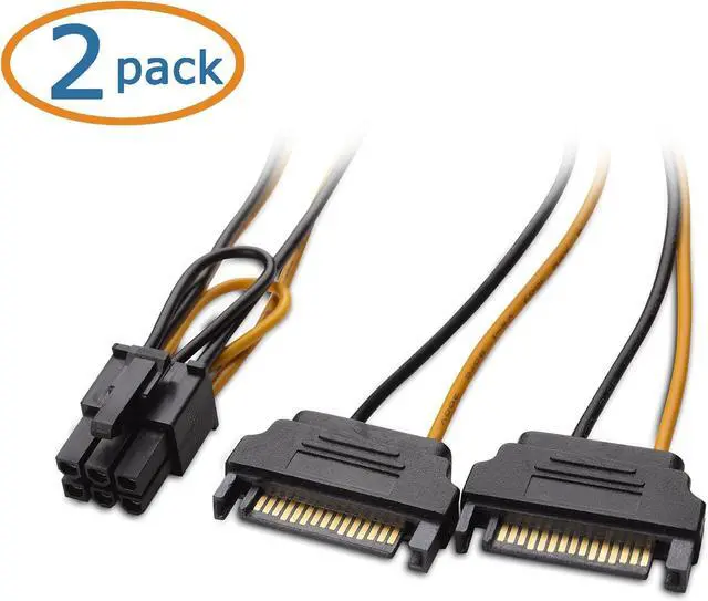PCI express power cable video card power cable adapter connects a PCIe video card to a power supply with two spare SATA power connectionsPSU upgrade saver power cable provides an option for a power supply without a PCIe connection for GPU power6 pin PCIe to dual 15 pin SATA female to male cable provides a convenient solution for video graphics card power with two SATA connectors for GPU cards that require more powerSturdy graphics card power cable has male SATA connectors with keyed rails and a female PCI connector with a latch for a secure connection on each end to prevent accidental disconnectionsVideo graphics card compatible with graphics cards from popular manufacturers such as GeForce GTX 750Ti EVGA GeForce GTX 750 Ti / GT 740 / GTX 950 / GTX 960 / GTX 980Ti Gigabyte GeForce GT 610/ GTX 750 / GV-N950OC-2GD / GTX 750 Ti / GV-N75TOC2-2GI Sapphire Radeon NITRO R9 380 and XFX RADEON R9 290