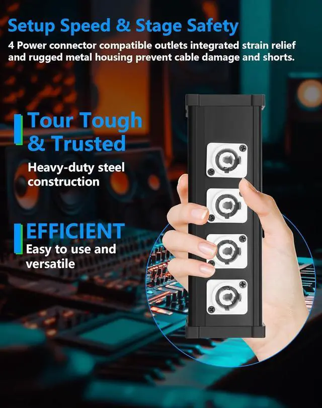 Speed & Stage Safety: 4 Power connector compatible outlets integrated strain relief and rugged metal housing prevent cable damage and shorts. Eliminate messy cable piles and dangerous daisy chaining organize power cleanly and safelyTour