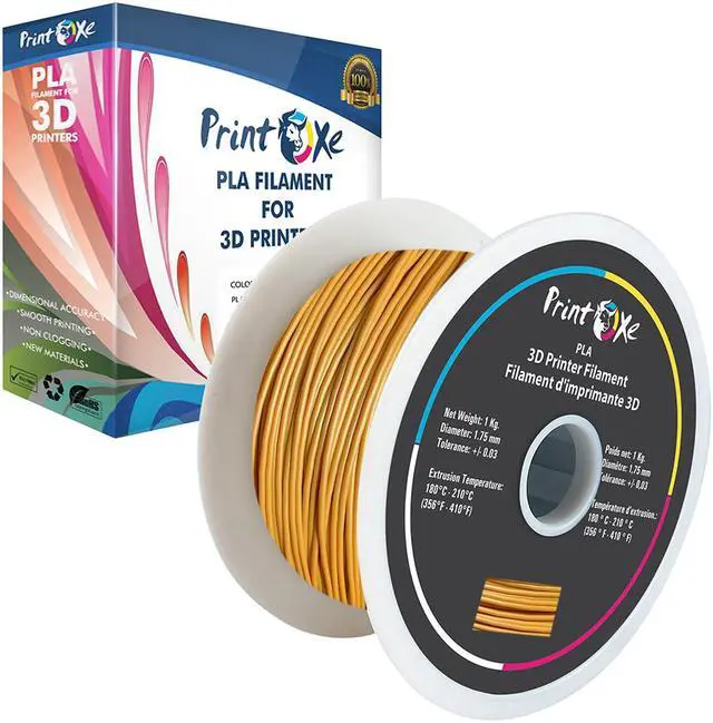 * PrintOxe 1st Grade 1.75 mm PLA 3D Printer Filament in Retail Package Shown in Image. * Net of 1 Kilogram ( 2.2 LBs) of PLA (Polylactic Acid) Gold Colour 3D Printer Filament. The Product is Vacuumed Sealed With Desiccant, Inside The Box, For Best Protection From Humidity & Moisture.