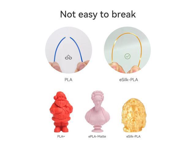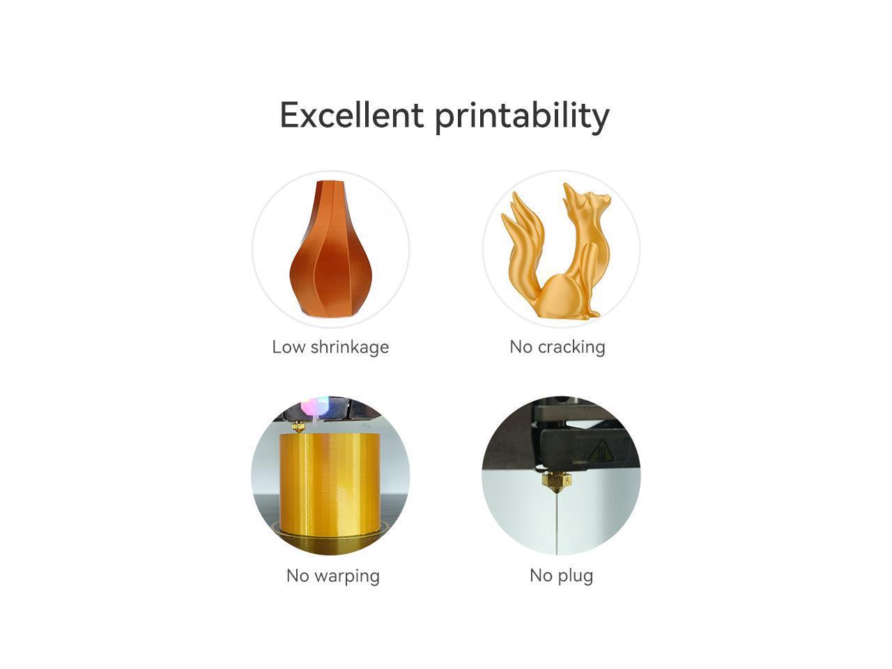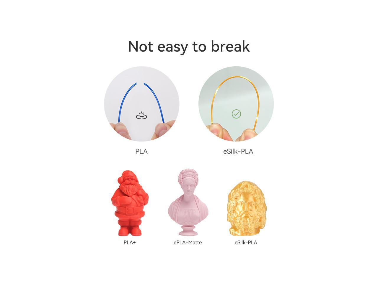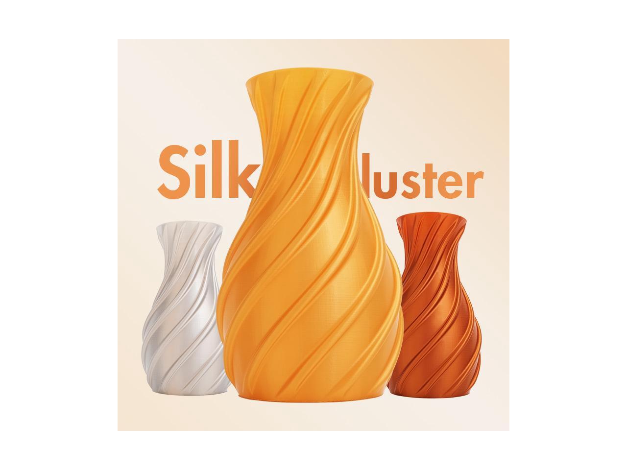 - Silk Metal PLAShinny surface with silk luster, giving smooth, pearly and unique touch. No extra polishing needed, printing at a high detail results in a beautiful finish. Unique silky smooth appearance gives out shiny eye-popping glossy prints, good printing effect.