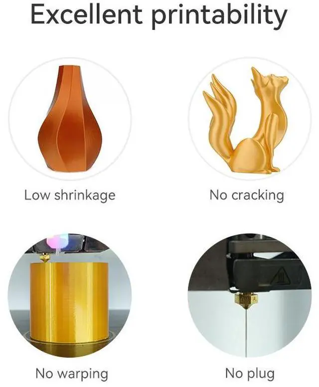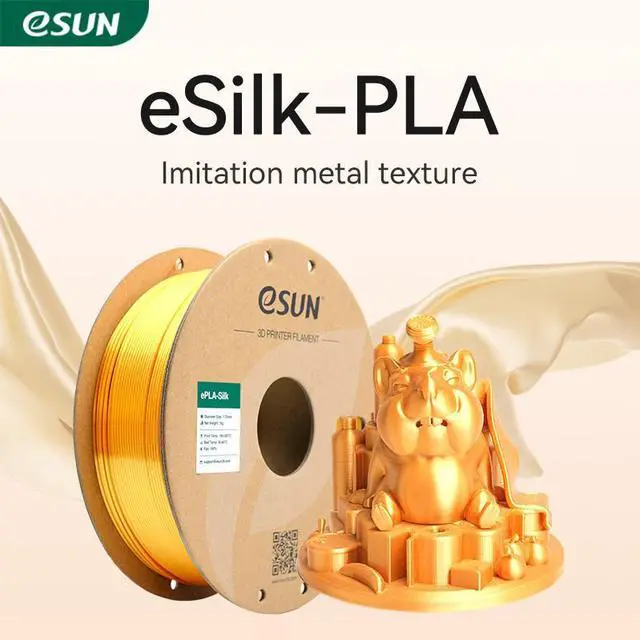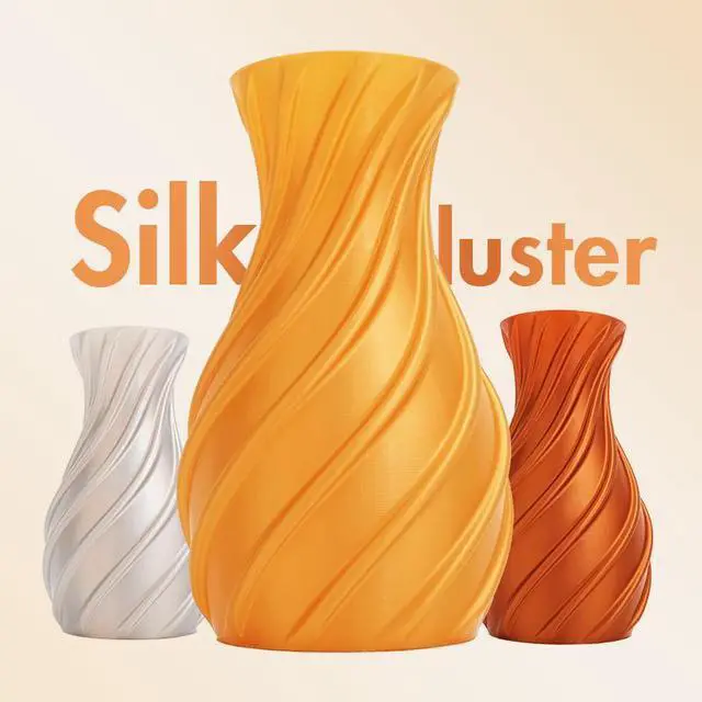 Silk Metal PLAShinny surface with silk luster, giving smooth, pearly and unique touch. No extra polishing needed, printing at a high detail results in a beautiful finish. Unique silky smooth appearance gives out shiny eye-popping glossy prints, good printing effect.