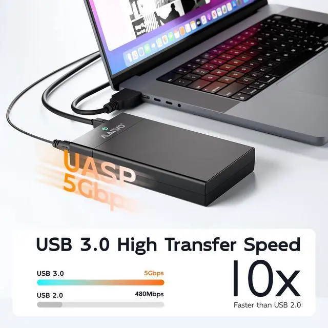 5Gbps Transfer Speed with UASPThis sata to usb3.0 adapter case equips with JMS578 chipset and USB 3.0 Type-B interface, can reach 5Gbps transmission speed(theoretical) with UASP protocol for high performance. Backward compatible with USB2.0 and USB1.1 ports.