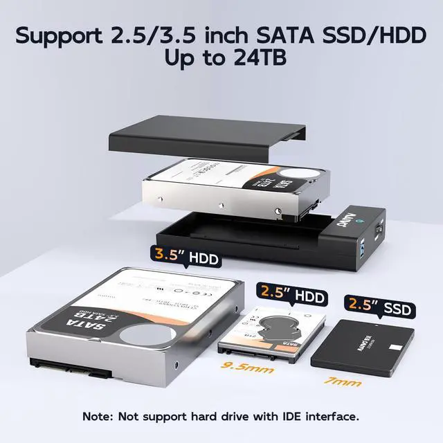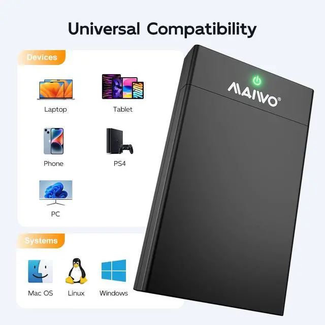 Universal CompatibilityThis hard drive enclosure is compatible with 2.5/3.5 inch SATA I/II/III SSD/HDD, up to 24TB maximum of data storage for desktop, laptop, PS4, router, TV and etc. Support Windows XP/7/8/10, Linux, Mac OS.