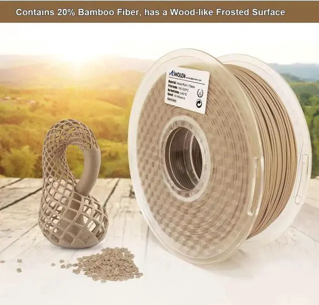 PREMIER MATERIAL: Made from PLA and 20% bamboo particles. Prints just like normal PLA with gorgeous surface of light wood color and texture. The print even smells like wood.
