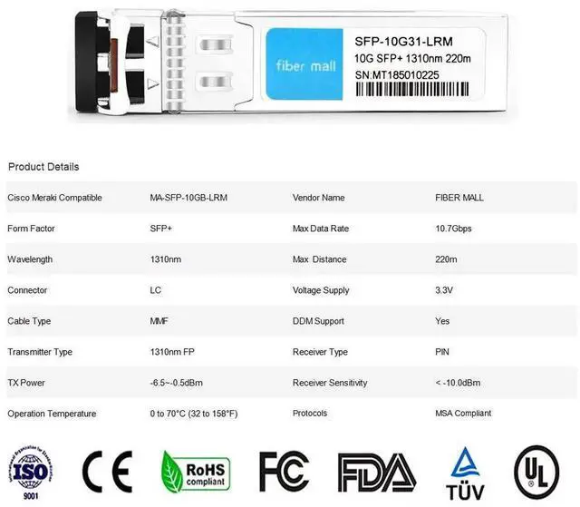 10G SFP LRM for Cisco Meraki MA-SFP-10GB-LRM SFP-10G-LRM 10GBASE-LRM SFP+ 1310nm, 220m/300m, LC DOM MMF/SMF ModuleTransceiver