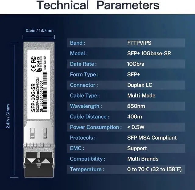 High-Speed Performance: Supports up to 10Gbps data rates with an 850nm VCSEL wavelength, compatible with SMF links up to 400m. Low power consumption of 0.5W and RoHS compliant.