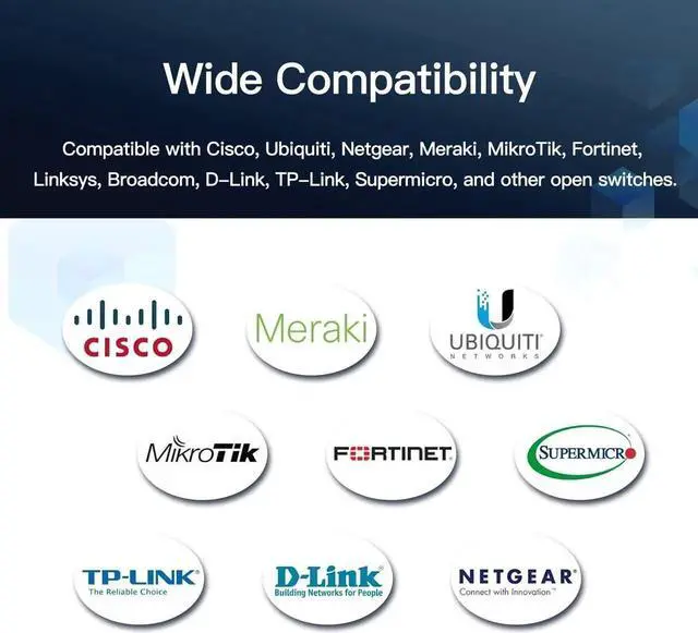 Device Compatibility: This transceiver is compatible with a wide range of equipment including Cisco, Meraki, Ubiquiti, D-Link, Supermicro, TP-Link, Broadcom, Linksys, Huawei, MikroTik, HPE, Netgear, Aruba, and other open switches. It is ideal for 10GBase networking devices such as fiber switches, routers, network interface cards (NICs), NAS, and 10Gb media converters. Additionally, it offers backward compatibility with 1Gbps devices, ensuring flexibility and ease of integration into existing network infrastructures. Anti-static protection ensures safe and reliable connections.