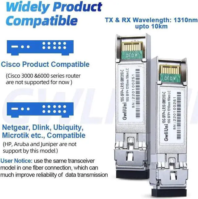 • Widely Compatible The SFP+ transceiver are widely compatible with Cisco products(Cisco 3000 &6000 series router are not supported) and Netgear, MikroTik, Ubiquity, DLink etc., ( Not recommended for HP, Juniper and Aruba products). The fiber module also works well with switch, router, media converter and more 10G SFP+ optic ports