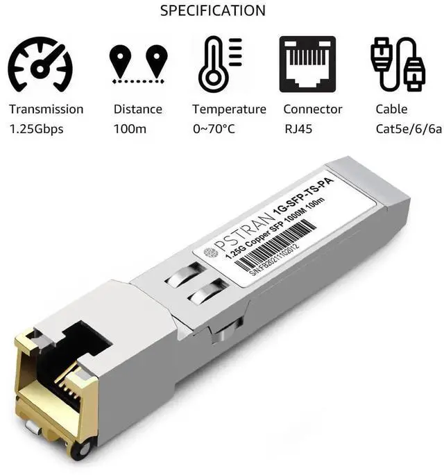 the 1000BASE-T SFP RJ45 Copper Transceiver Module supports up to 100m link lengths over a copper connection via a RJ-45 connector. Built-in high performance Chip, Max. Power Consumption 1.2W, Commercial Temperature Range 0 to 70°C (32 to 158°F)