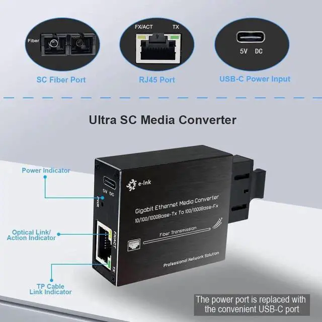 StarRoute Ultra Small Gigabit Fiber Media Converter, Duplex SC Single Mode 20km SM 1310nm, USB-C Power Port