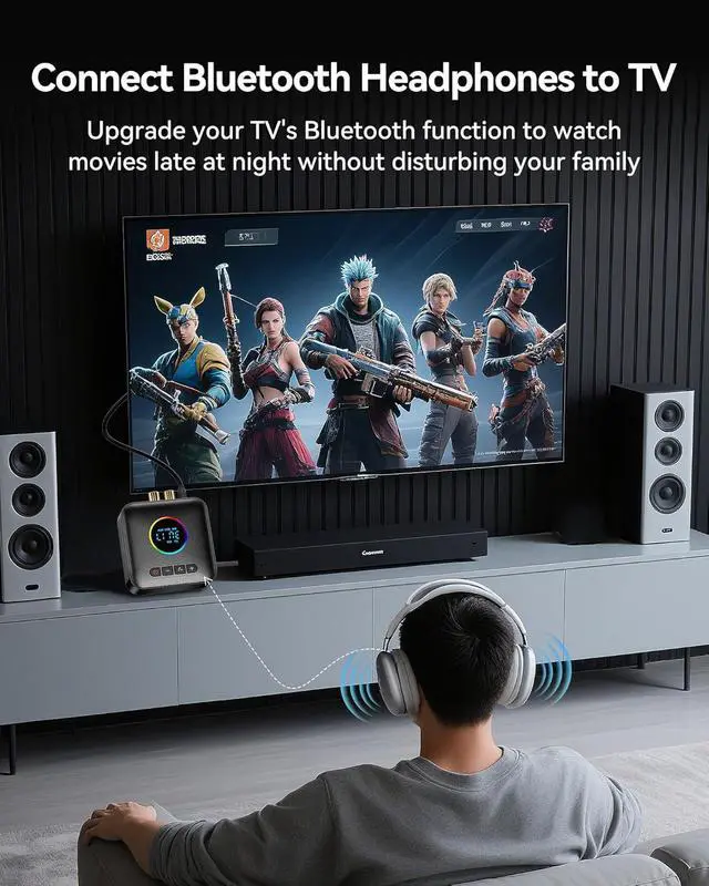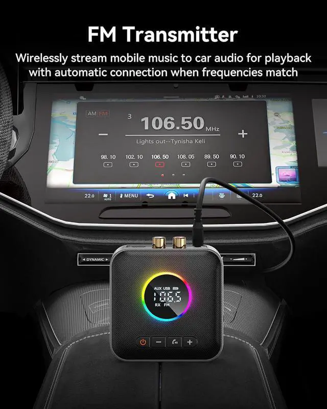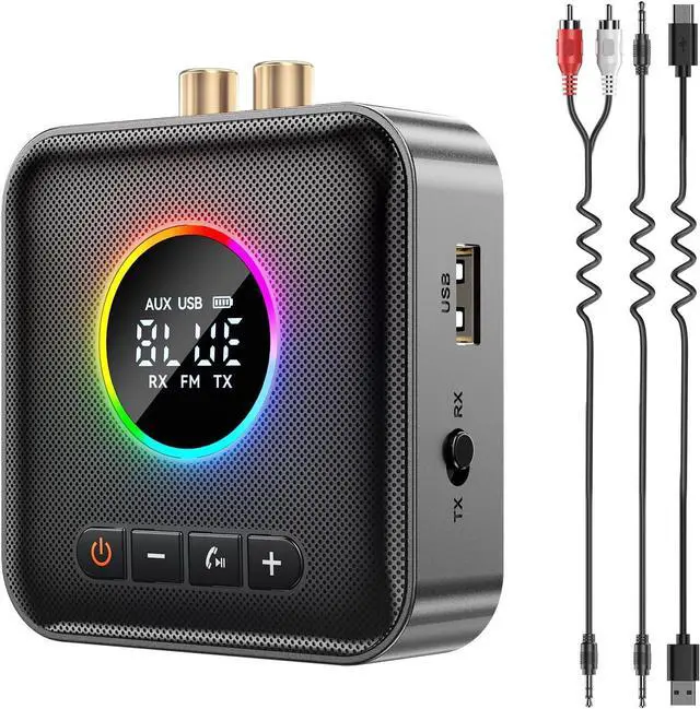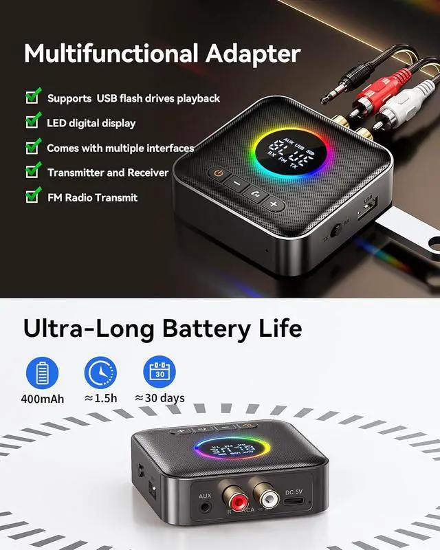 Multi-functional: 3-in-1 design,featuring Bluetooth transmitter,Bluetooth receiver,and FM transmitter functions,perfectly compatible with home entertainment systems.The upgraded receiving mode supports simultaneous connection of two smartphones. Supports USB storage device playback and transmission (no Bluetooth required).