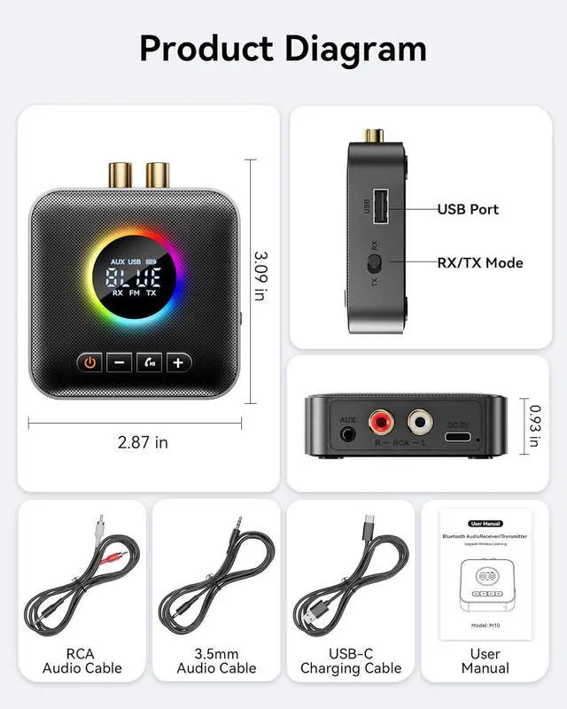 1 x M10 Bluetooth Adapter 1 x AUX 3.5mm Audio Cable 1 x RCA Audio Cable 1 x USB power cable 1 x Users Manual