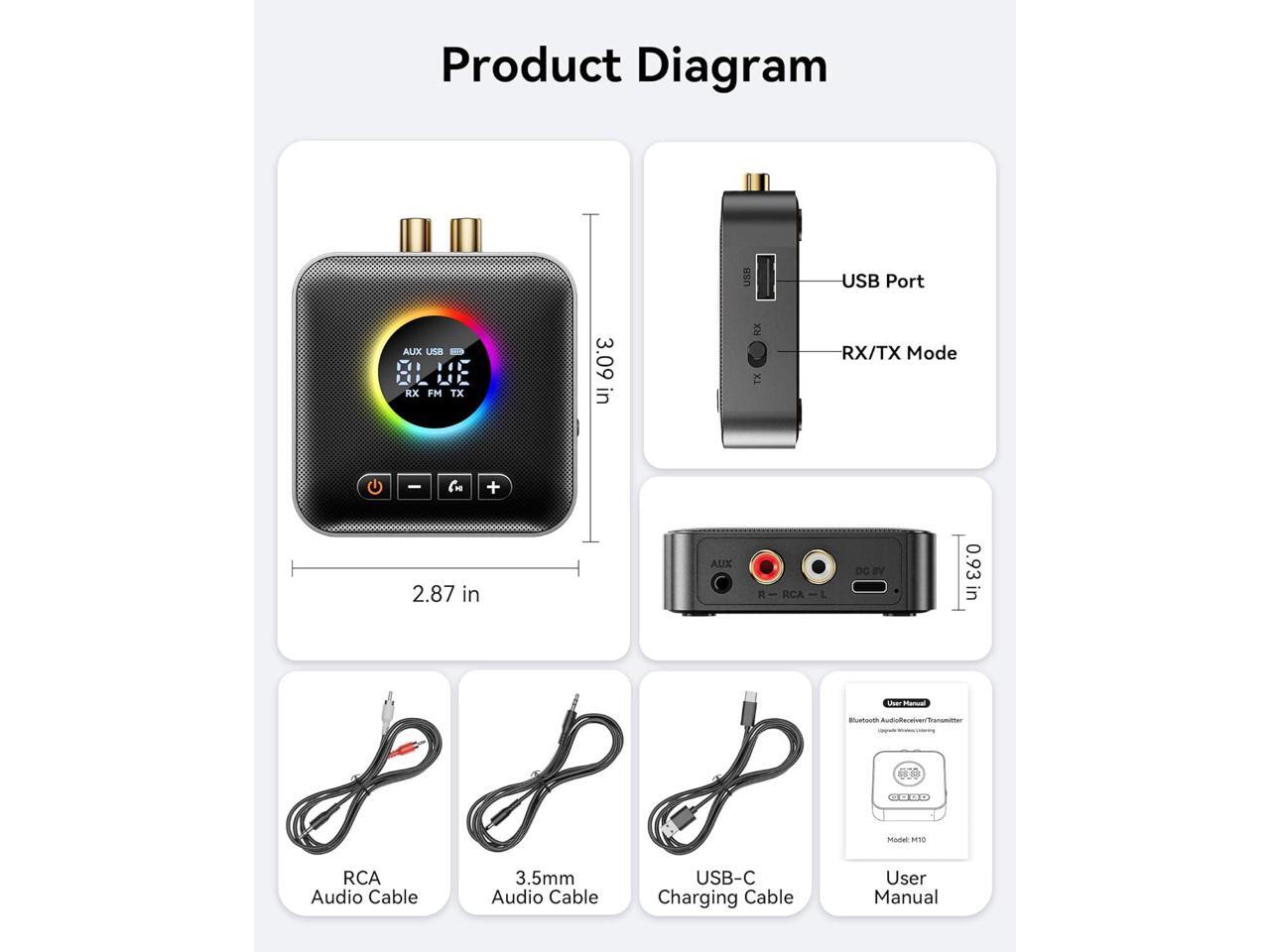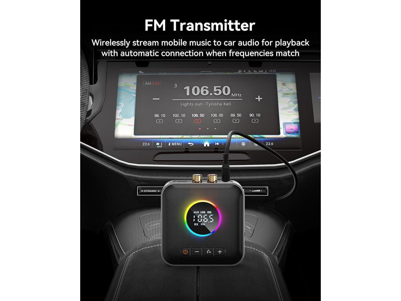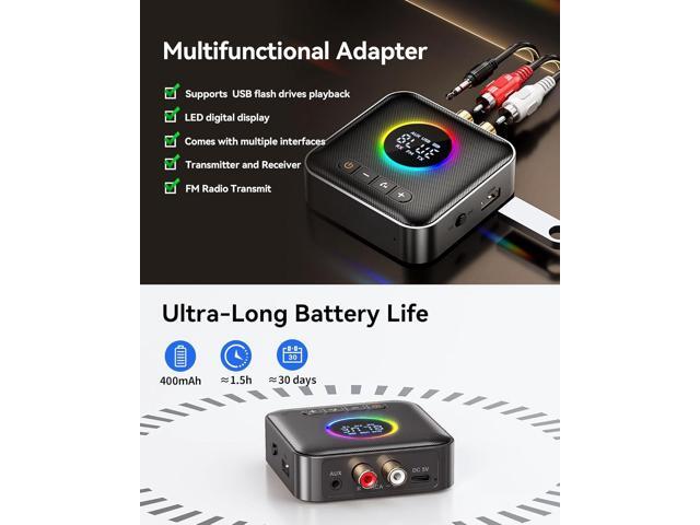 Multi-functional: 3-in-1 design,featuring Bluetooth transmitter,Bluetooth receiver,and FM transmitter functions,perfectly compatible with home entertainment systems.The upgraded receiving mode supports simultaneous connection of two smartphones. Supports USB storage device playback and transmission (no Bluetooth required).