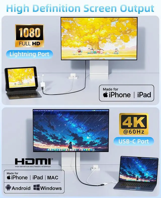 ![Main image of [MFi Certified] USB-C & Lightning to HDMI Adapter for iPhone 17/16/15 to TV/Projector, 4K@60Hz Digital AV Converter, iPad to TV Adapter,Apple Lightning to HDMI for iPad/MacBook/Samsung,60W PD](https://c1.neweggimages.com/productimage/nb640/C5JMD2603230C89PT7E.jpg)