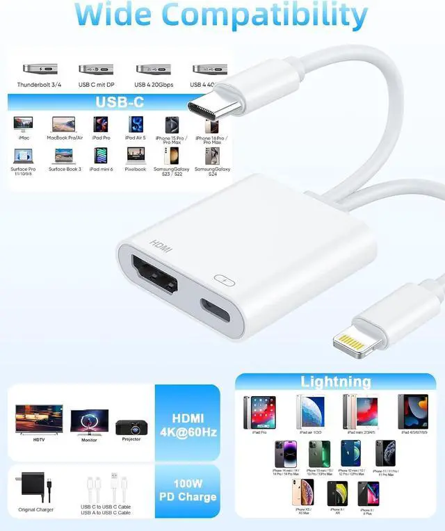 ![Alt view image 4 of 7 - [MFi Certified] USB-C & Lightning to HDMI Adapter for iPhone 17/16/15 to TV/Projector, 4K@60Hz Digital AV Converter, iPad to TV Adapter,Apple Lightning to HDMI for iPad/MacBook/Samsung,60W PD](https://c1.neweggimages.com/productimage/nb640/C5JMD2603230C89UEC5.jpg)
