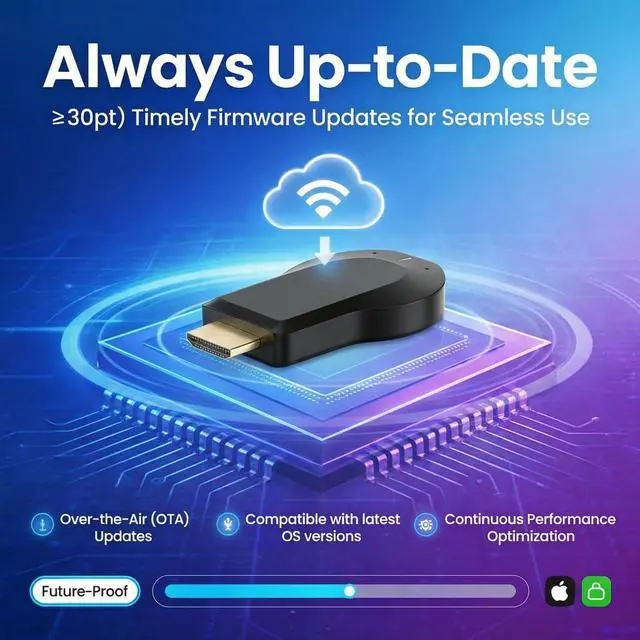We deliver timely firmware updates straight to your dongleso it keeps working seamlessly with the latest iOS, Android, and Windows devices. No effort required.