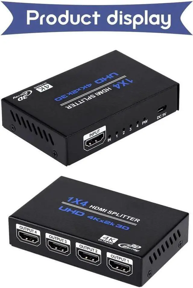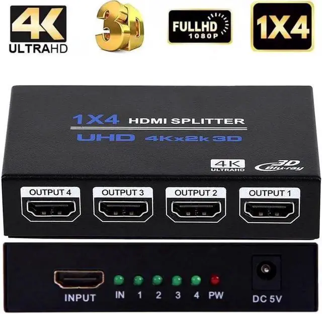 What you Get: 1 x HDMI Splitter 1 in 4 out, 1x 5V DC Power Supply, 1 x User manual.